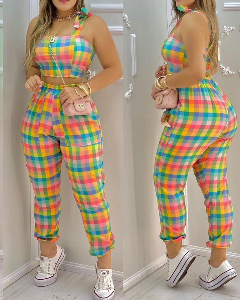 Style:Chic Type:Pants Sets Material:100%Polyester Neckline:Square Neck Sleeve Style:Sleeveless Length:Long Pattern Type:Plaid,Colorblock Decoration:Pocket Fit Type:Regular Occasion:Daily Package Include:Pants Sets