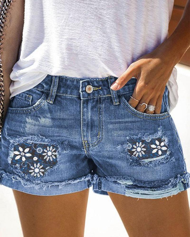 Style:Casual Type:Denim Shorts Material:100%Polyester Length:Above Knee Pattern Type:Floral Decoration:Raw Hem,Ripped,Zipper Fit Type:Regular Occasion:Daily,Vacation Package Include:1*Shorts