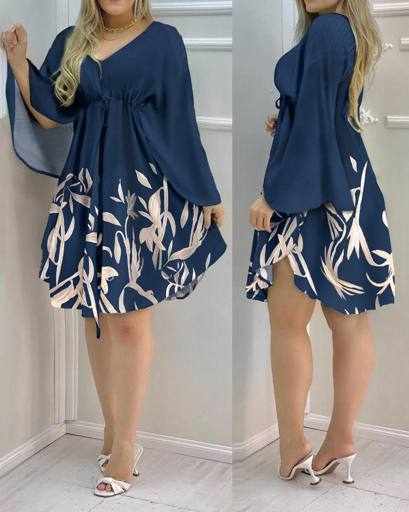 Plants Print Cloak Sleeve Drawstring Casual Dress