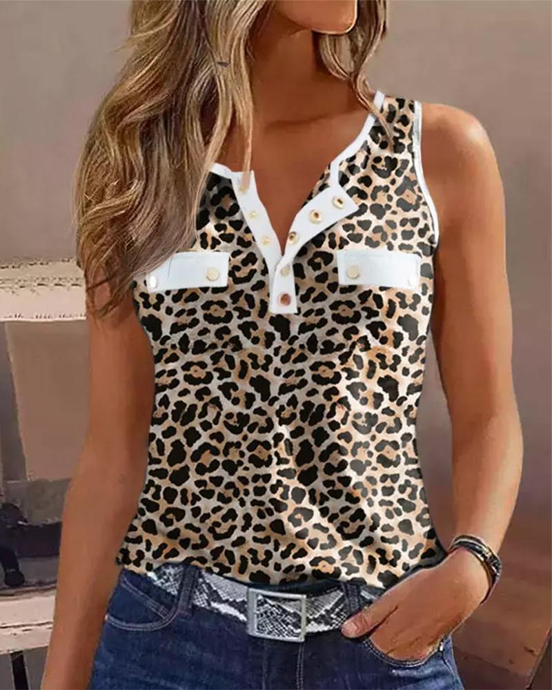 Leaf Print Double Strap U-Neck Tank Top