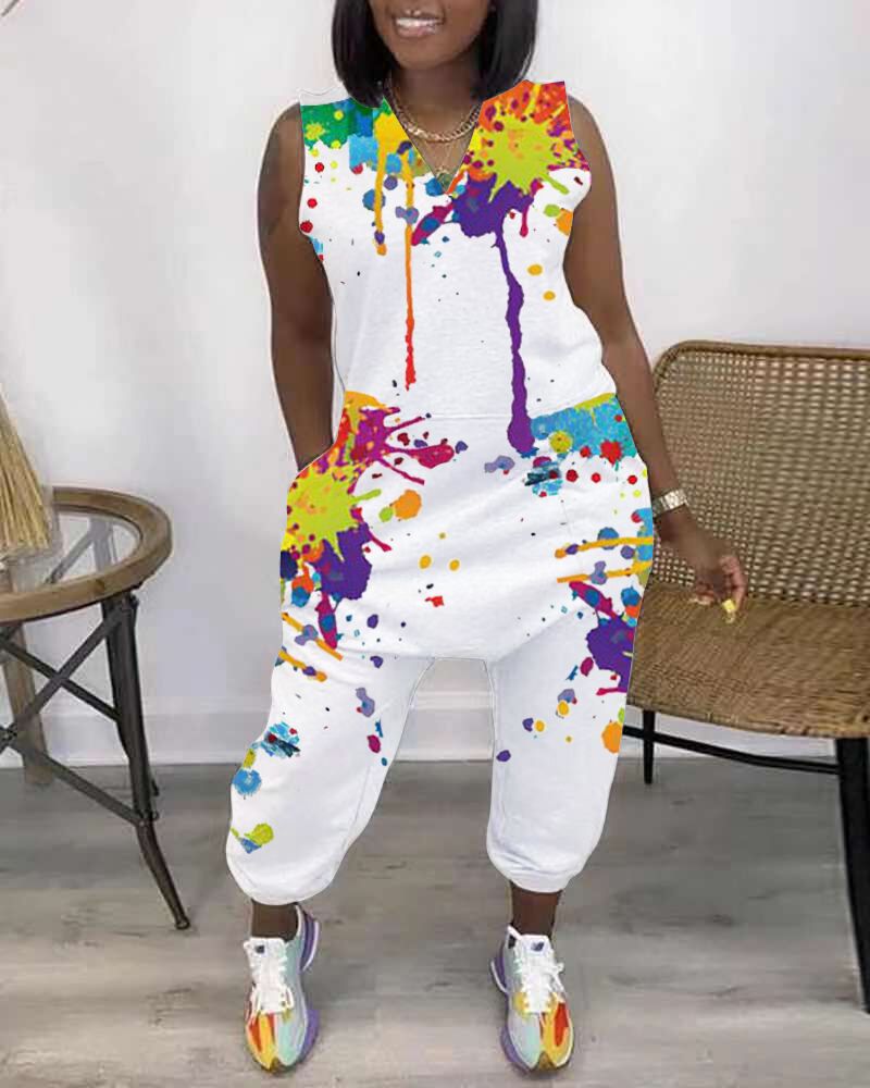 Ink Splash Print Sleeveless Pocket Design Jumpsuit