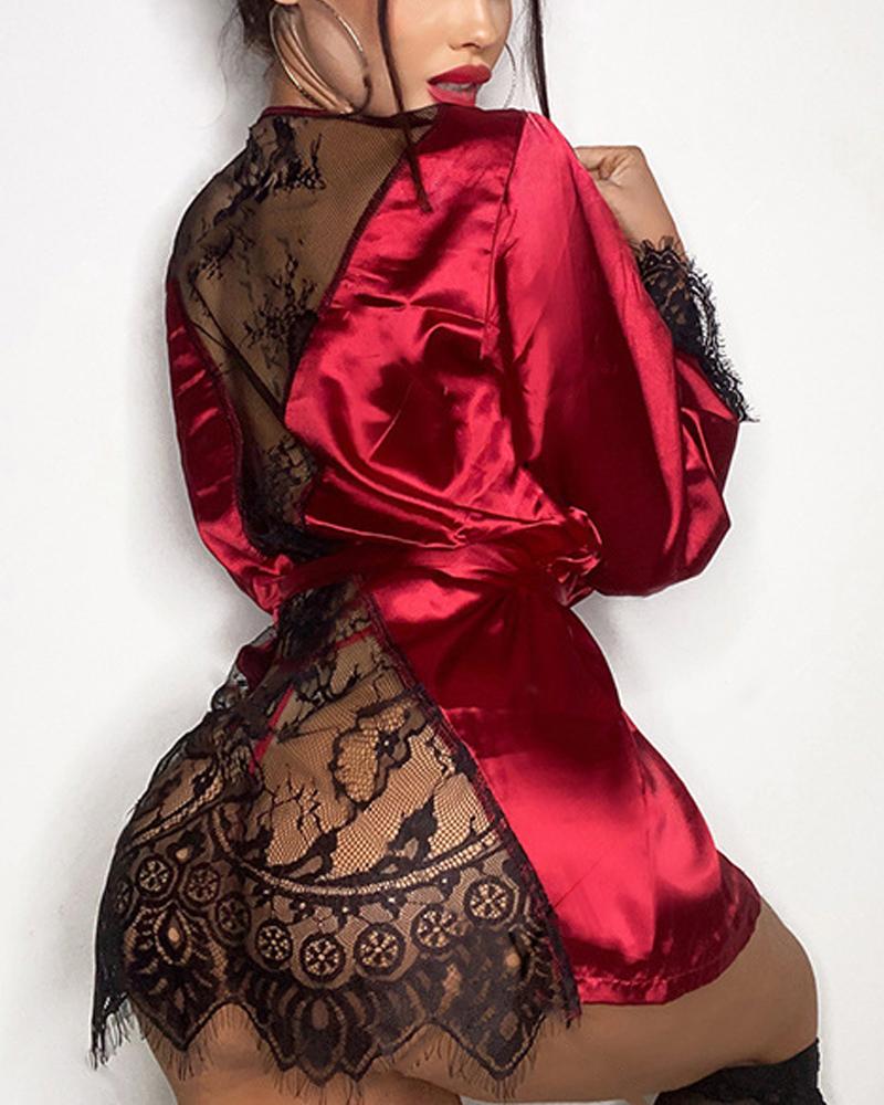 Style:Romantic,Sexy Type:Babydolls Material:97%Polyester,3%Spandex Neckline:Plunge Sleeve Style:Long Sleeve Length:Mini Pattern Type:Contrast Paneled Decoration:Contrast Lace,Tied Detail Fit Type:Regular Occasion:Home Package Include:1*Babydoll With Thong
