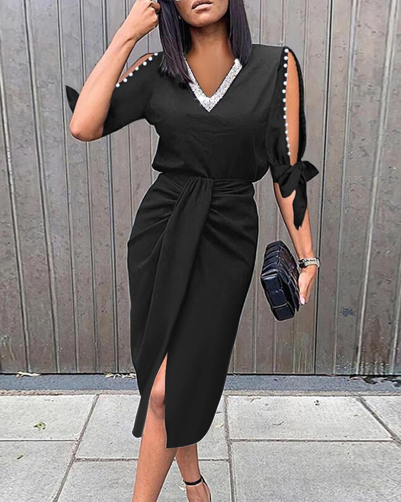 Style:Elegant Type:Straight Material:97%Polyester,3%Spandex Neckline:Cold Shoulder Sleeve Style:Half Sleeve,Split Sleeve Length:Midi Pattern Type:Contrast Paneled Decoration:Beaded,Tied Detail,Ruched,Slit Fit Type:Regular Occasion:Work Package Include:1* Dress