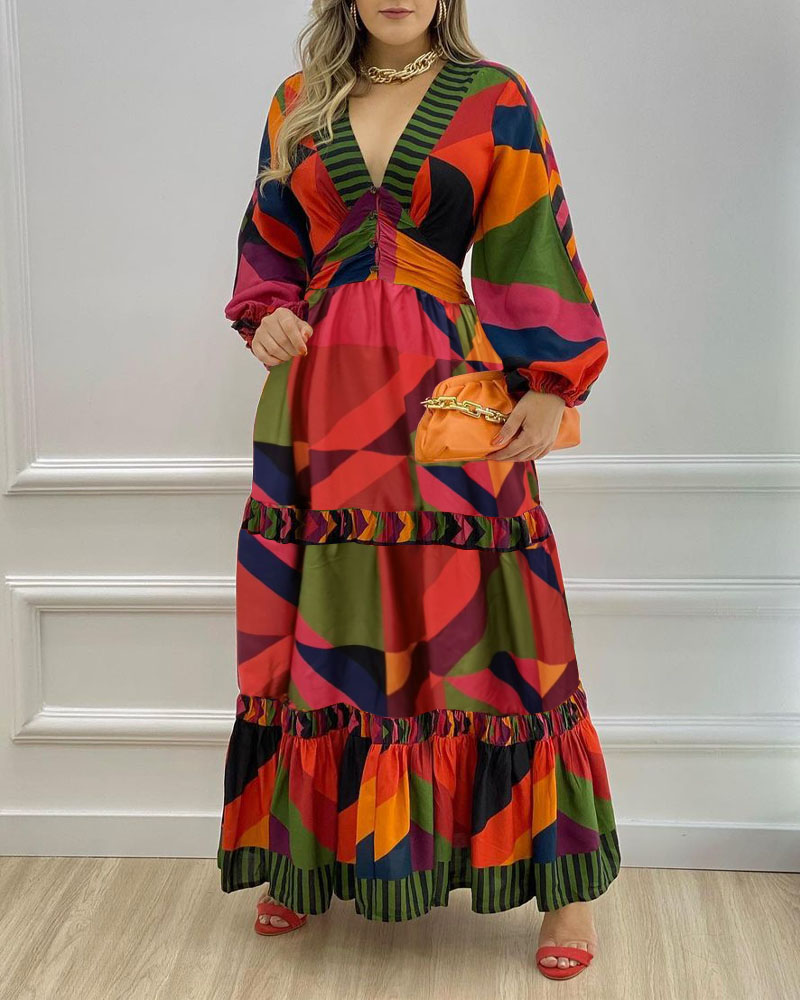 Style:Casual,Chic Type:A Line Material:100%Polyester Neckline:V-Neck Sleeve Style:Lantern Sleeve,Long Sleeve Length:Maxi Pattern Type:Geometric Decoration:Button,Lantern Sleeve Fit Type:Regular Occasion:Daily Package Include:1* Dress