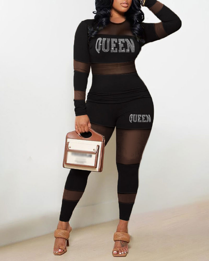 Style:Sexy Type:Pants Sets Material:97%Polyester,3%Spandex Neckline:O-neck Sleeve Style:Long Sleeve Length:Long Pattern Type:Letter Decoration:Rhinestone,Sheer Mesh Fit Type:Skinny Occasion:Daily Package Include:1*Pants Set