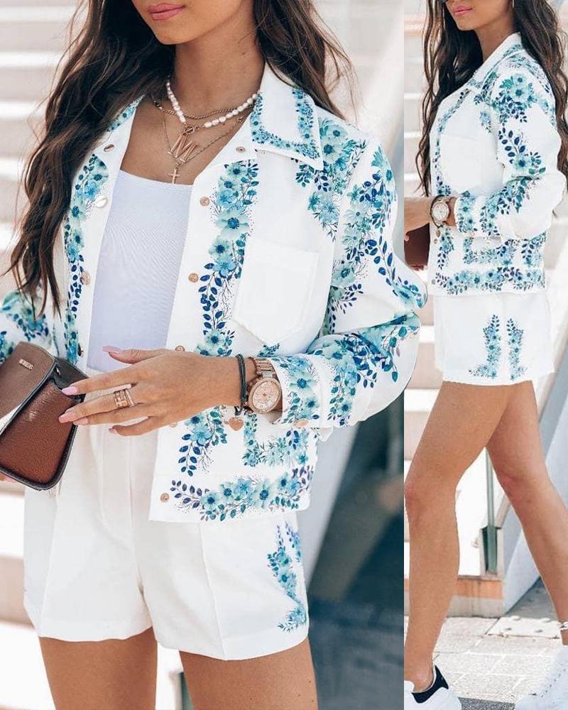 Style:Casual Type:Shorts Set Material:100%Polyester Neckline:Turn-down Collar Sleeve Style:Long Sleeve Length:Above Knee Pattern Type:Plants Decoration:Button,Pocket,Zipper Fit Type:Regular Occasion:Daily,Vacation Package Include:1*Shorts Set