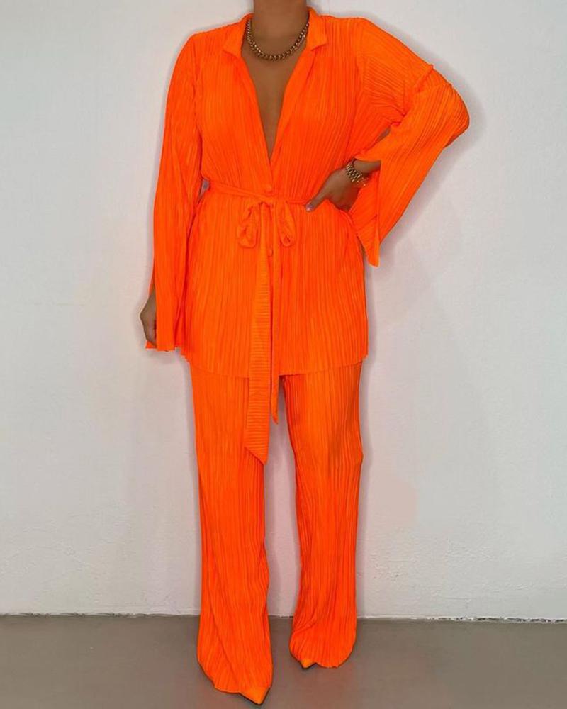 Style:Chic Type:Pants Sets Material:97%Polyester,3%Spandex Neckline:Turn-down Collar Sleeve Style:Long Sleeve Length:Long Pattern Type:Plain Decoration:Tied Detail Fit Type:Regular Occasion:Daily Package Include:Pants Sets