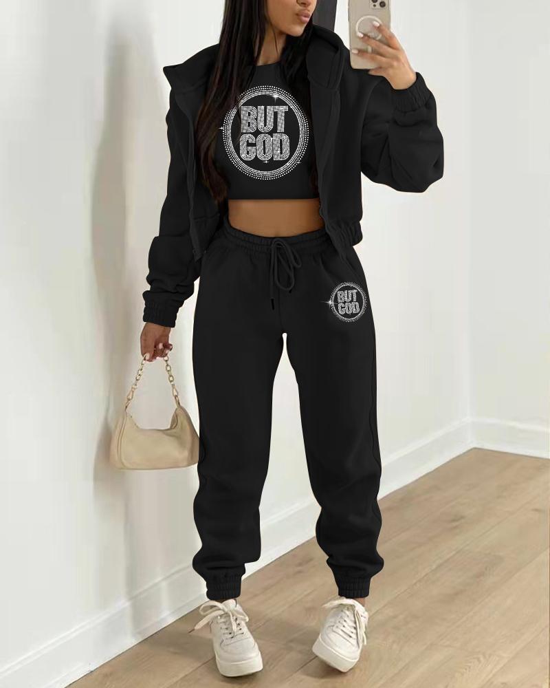 3PCS But God Rhinestone Crop Top & Pants Set With Coat