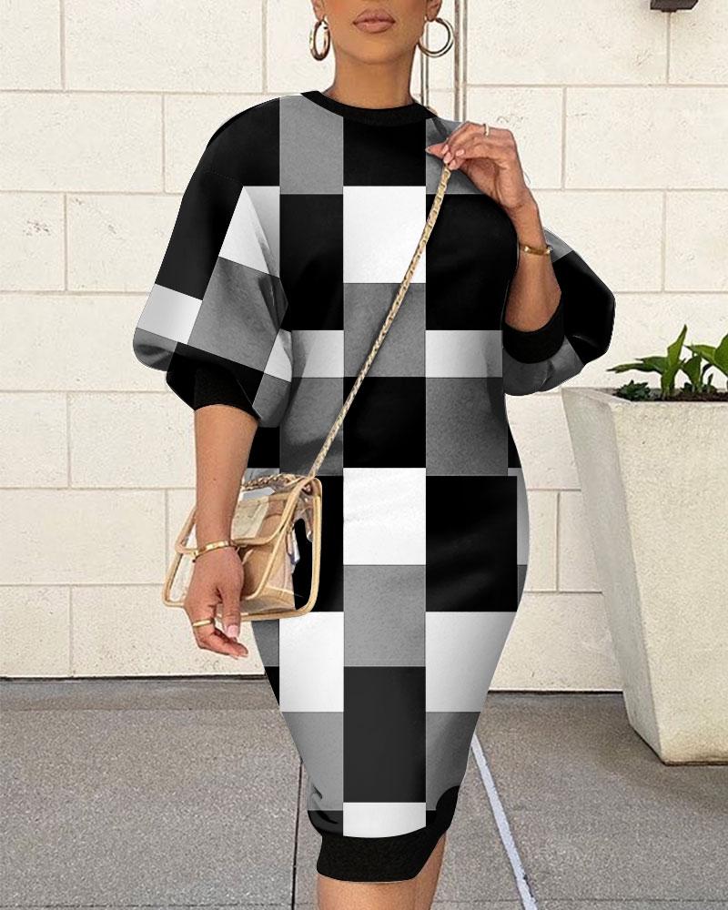 Style:Casual Type:Sweatshirt Material:97%Polyester,3%Spandex Neckline:O-neck Sleeve Style:Lantern Sleeve,Long Sleeve Length:Midi Pattern Type:Colorblock,Geometric Fit Type:Regular Occasion:Daily Package Include:1* Dress