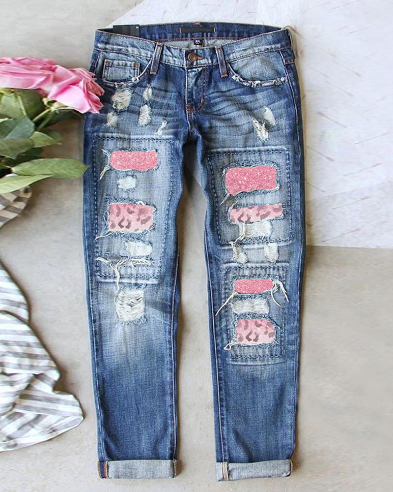 Valentine's Day Contrast Cheetah Print Ripped Jeans