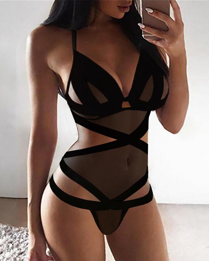 Style:Sexy Type:Teddies Material:97%Polyester,3%Spandex Neckline:Low Cut Sleeve Style:Spaghetti Strap Length:Regular Pattern Type:Plain Decoration:Sher Mesh,Cutout Fit Type:Regular Occasion:Home Package Include:1*Teddy