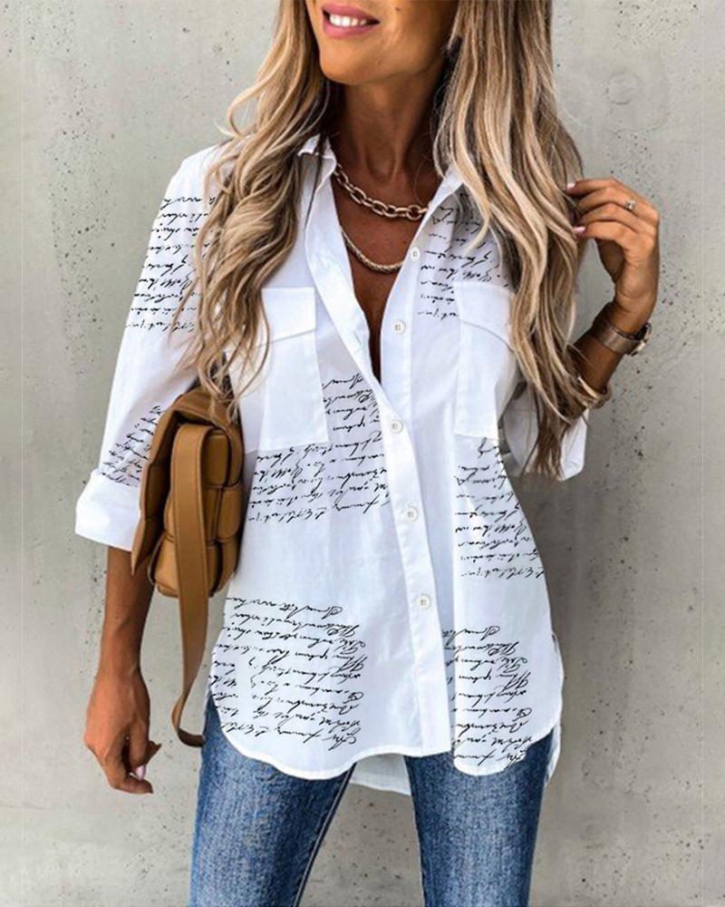 Style:Casual,Chic Type:Shirt Material:100%Polyester Neckline:Turn-down Collar Sleeve Style:Long Sleeve,Roll Up Sleeve Length:Regular Pattern Type:Letter Decoration:Button,Pocket,Roll Up Sleeve Fit Type:Regular Occasion:Daily Package Include:1*Shirt