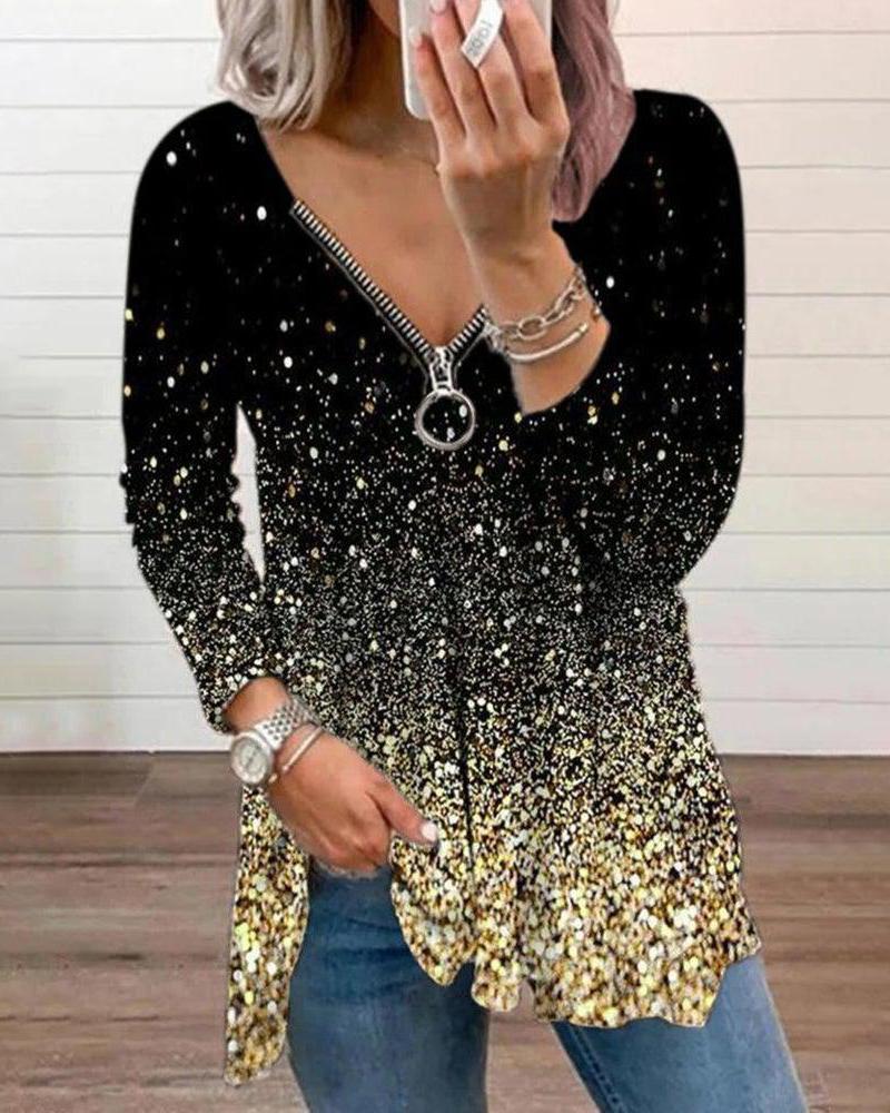 Style:Casual Type:Tee Material:97%Polyester,3%Spandex Neckline:V-Neck Sleeve Style:Long Sleeve Length:Regular Pattern Type:Graphic Decoration:Zipper Fit Type:Regular Occasion:Daily Package Include:1*Top