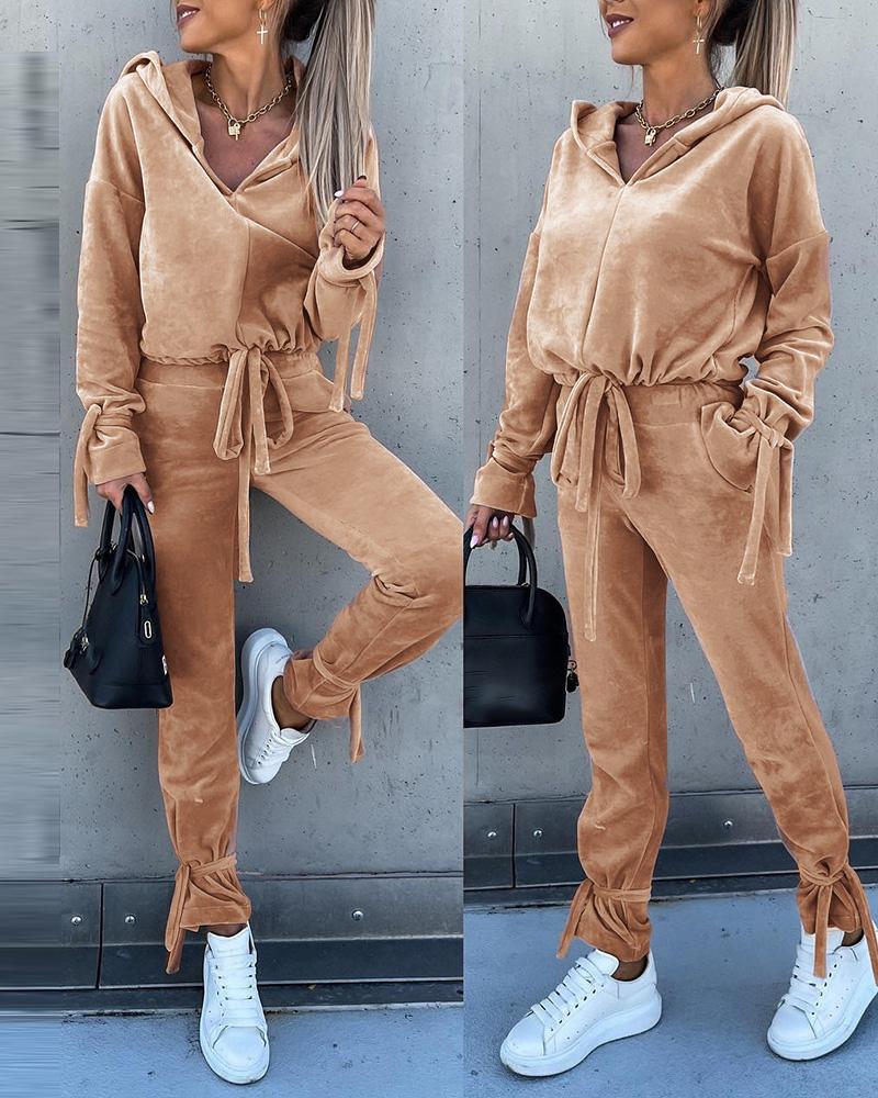 Velvet Tied Detail Hooded Top & Pocket Design Pants Set