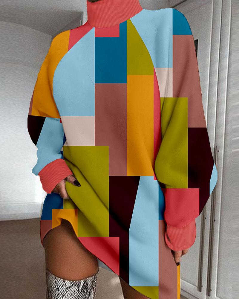 Style:Casual Type:Straight Material:97%Polyester,3%Spandex Neckline:High Neck Sleeve Style:Long Sleeve Length:Mini Pattern Type:Colorblock,Geometric Fit Type:Regular Occasion:Daily Package Include:1* Dress