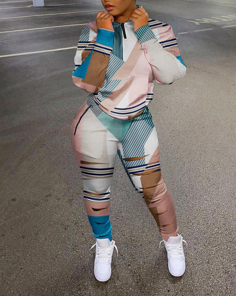Geometric Print Zip Detail Top & Ladder Cutout Pants Set