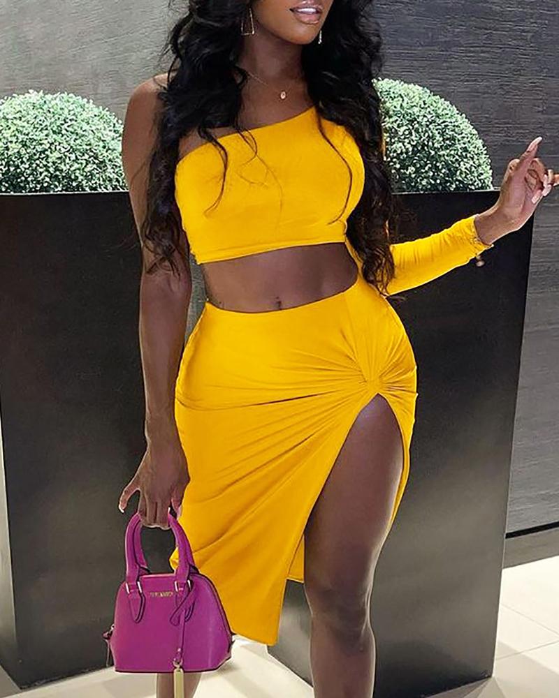 One Shoulder Crop Top & Twisted High Slit Skirt Set