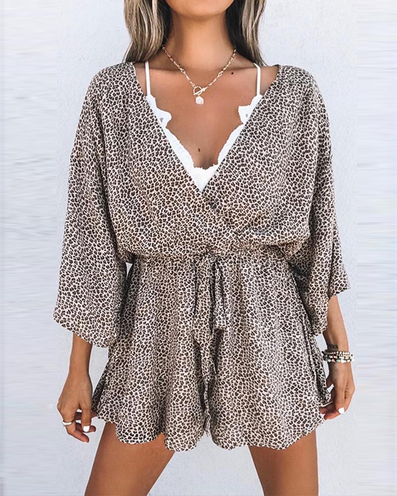 Style:Casual,Chic Type:Romper Material:100%Polyester Neckline:V-Neck Sleeve Style:Batwing Sleeve,Three Quarters Length:Above Knee Pattern Type:Leopard Decoration:Batwing Sleeve Fit Type:Oversized With Belt:Yes Occasion:Daily Package Include:1*Romper (With Belt)