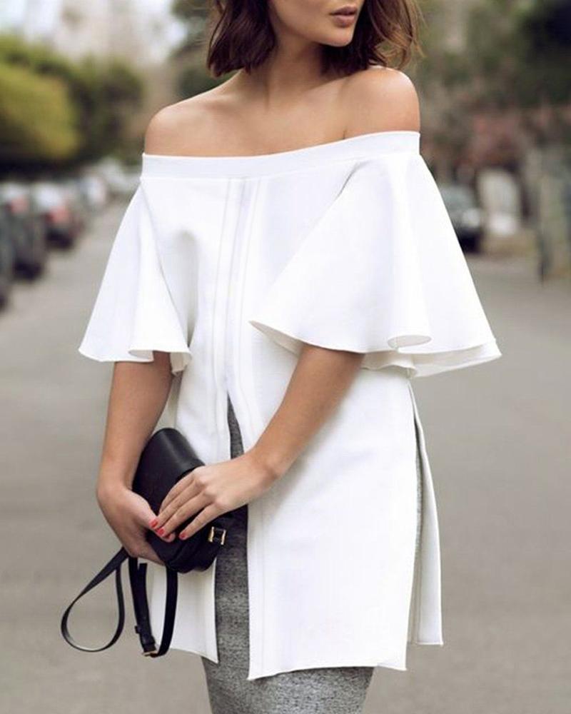 Style:Chic Type:Blouses Material:97%Polyester,3%Spandex Neckline:Off the Shoulder Sleeve Style:Bell Sleeve,Short Sleeve Length:Regular Pattern Type:Plain Decoration:Bell Sleeve,Slit Fit Type:Regular Occasion:Daily Package Include:1* Blouse