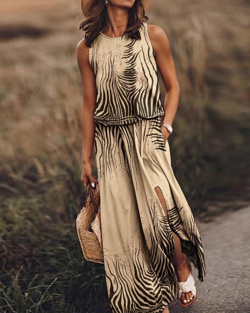 Style:Casual Type:Slit,Tank Material:97%Polyester,3%Spandex Neckline:Round Neck Sleeve Style:Sleeveless Length:Maxi Pattern Type:All Over Print Decoration:Pocket,Slit Fit Type:Regular Occasion:Daily,Vacation Package Include:1* Dress