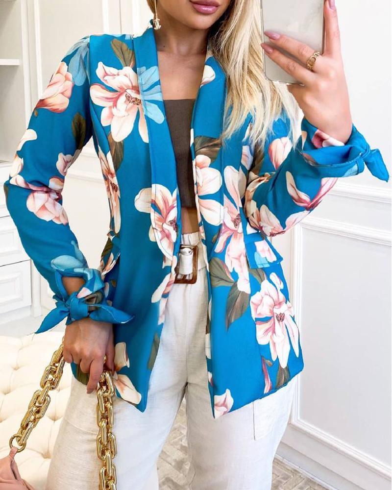 Floral Print Tied Detail Pocket Decor Blazer Coat