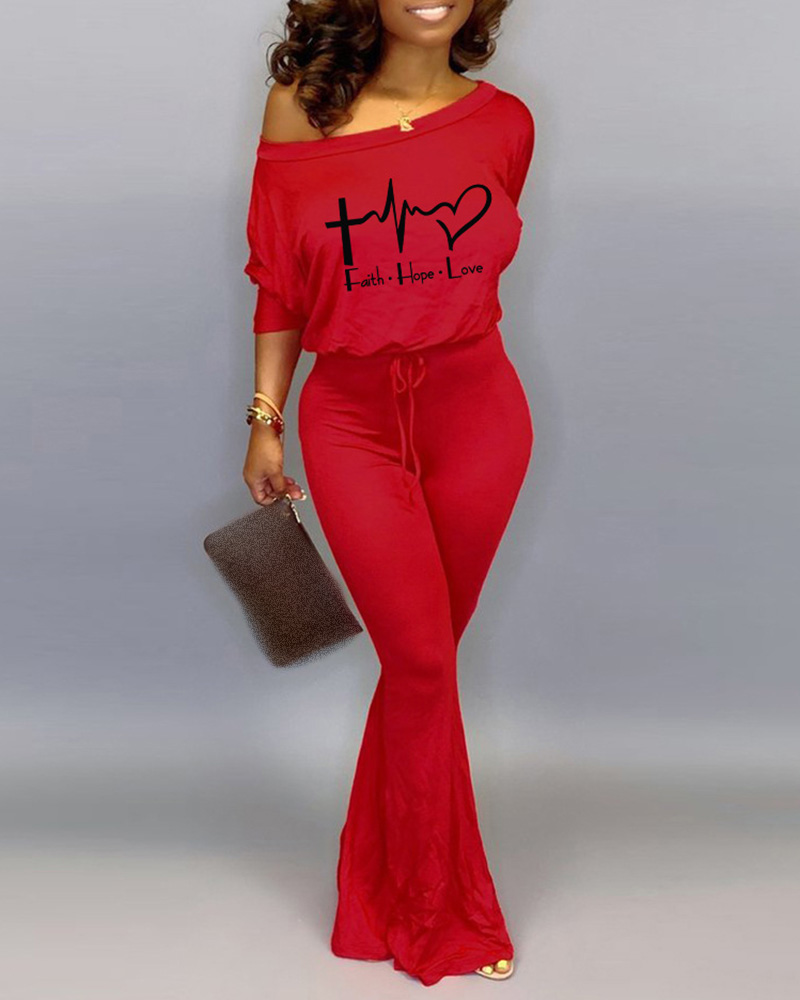 Letter Heart Print Drawstring Bootcut Jumpsuit