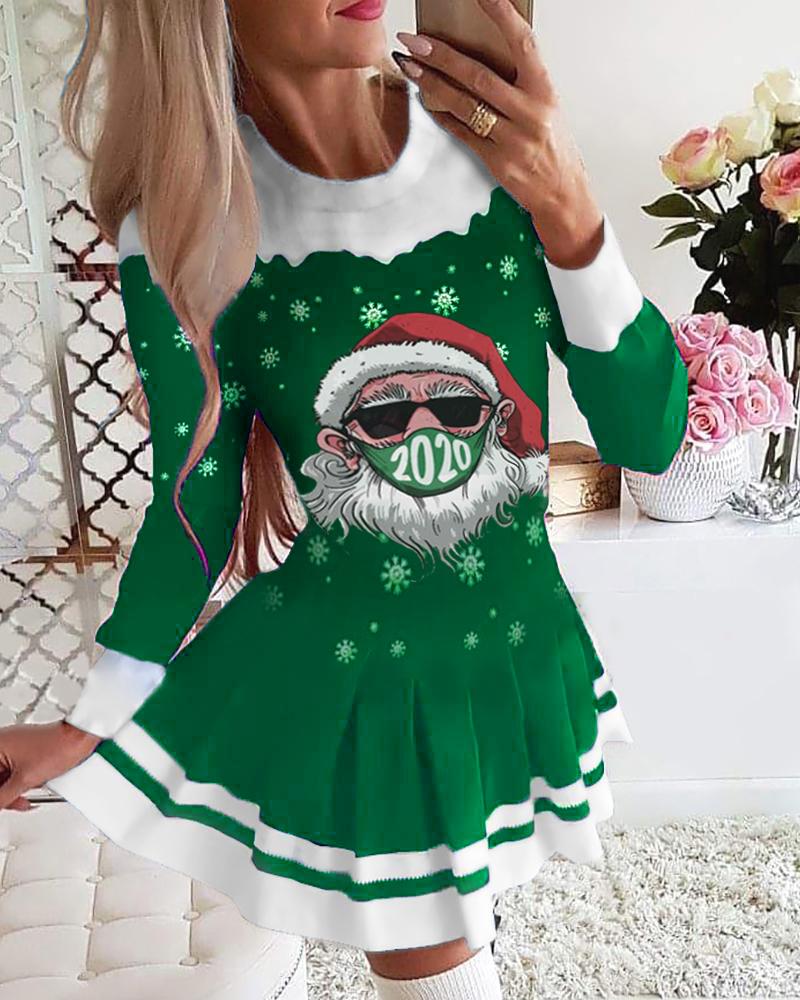 Christmas Santa Print Long Sleeve Pleated Dress