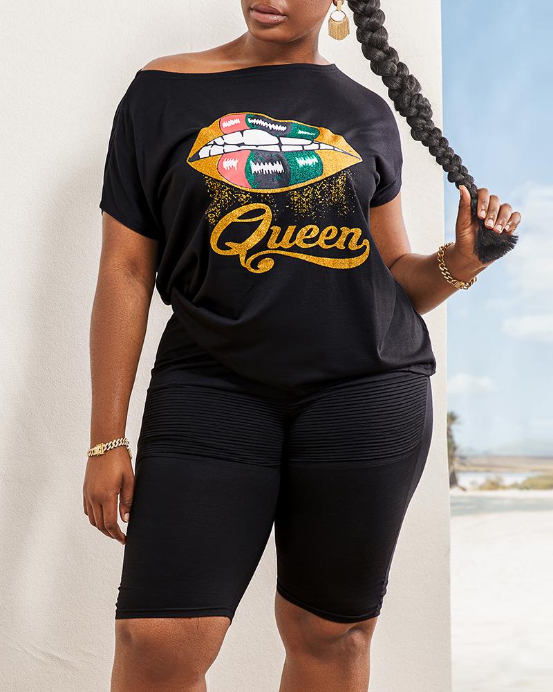 Plus Size Lip Queen Print Skew Neck Top & Shorts Set