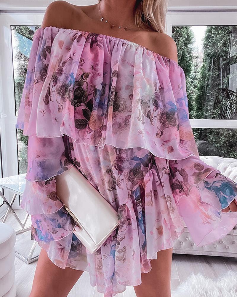 Style:Casual,Chic Type:Layered/Tiered Material:97%Polyester,3%Spandex Neckline:Off the Shoulder Sleeve Style:Long Sleeve Length:Mini Pattern Type:Floral Decoration:Ruched,Ruffles Fit Type:Regular Occasion:Daily,Vacation Package Include:1* Dress Fabric Elasticity:Slight Stretch Sleeve Type:Bell Sleeve Sheer:No Care Instructions:Machine wash or professional dry clean