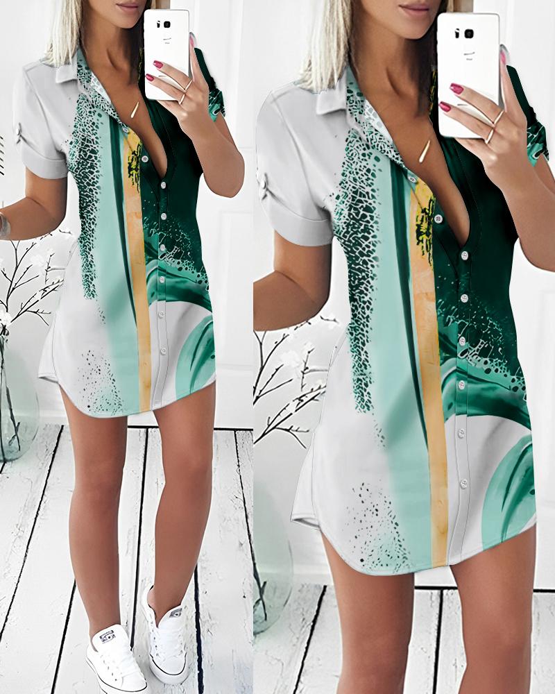 Style:Casual,Chic Type:Shirt Material:100%Polyester Neckline:Turn-down Collar Sleeve Style:Short Sleeve Length:Mini Pattern Type:Tie Dye Decoration:Button Fit Type:Regular Occasion:Daily Package Include:1* Dress Fabric Elasticity:Slight Stretch Sheer:No Care Instructions:Machine wash or professional dry clean Waist Line:Natural