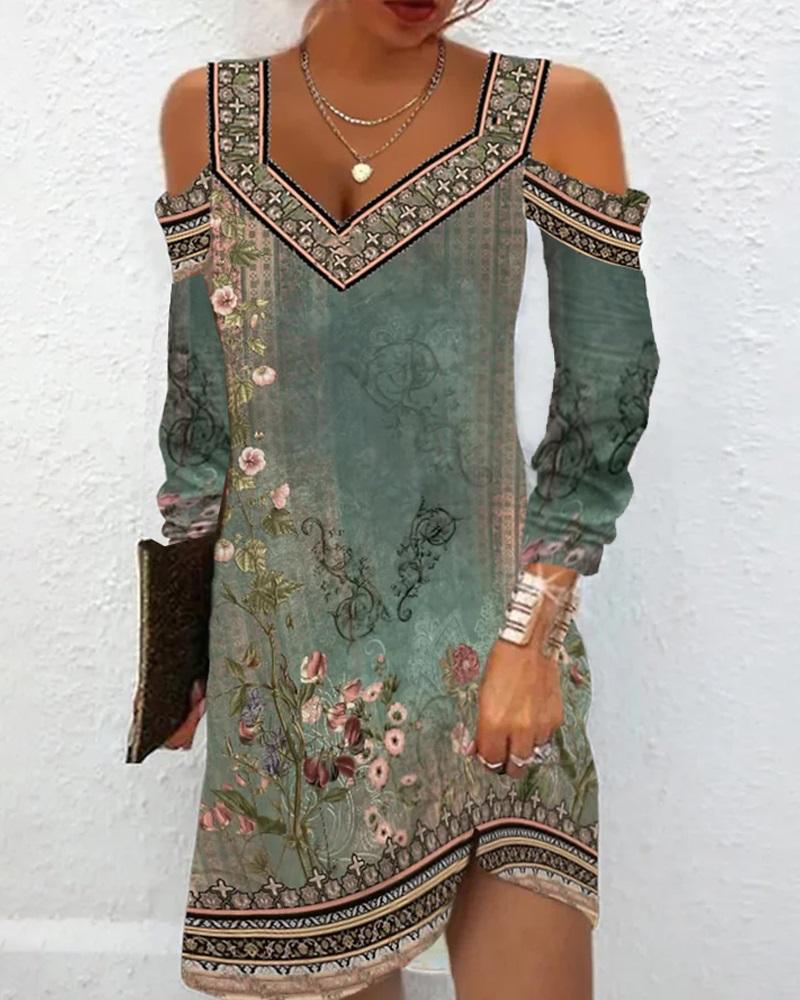 Floral Tribal Print Cold Shoulder Casual Dress
