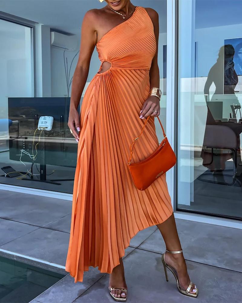 Style:Casual Type:Pleated Material:100%Polyester Neckline:One Shoulder Sleeve Style:Sleeveless Length:Asymmetrical Pattern Type:Plain Decoration:Hollow-out,Ruched Fit Type:Regular Occasion:Party Package Include:1* Dress Fabric Elasticity:Slight Stretch Sheer:No Care Instructions:Machine wash or professional dry clean