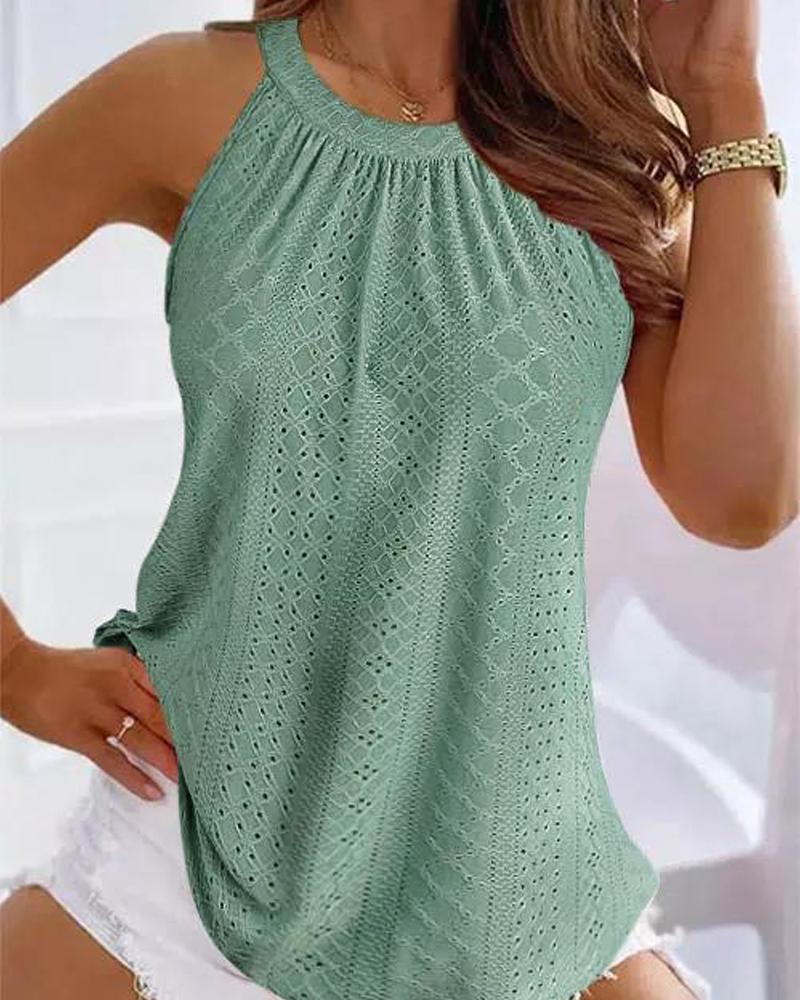 Style:Chic Type:Tank Material:97%Polyester,3%Spandex Neckline:O-neck Sleeve Style:Sleeveless Length:Regular Pattern Type:Plain Decoration:Eyelet Embroidery,Ruched Fit Type:Regular Occasion:Daily Package Include:1*Top Fabric Elasticity:Medium Stretch Sheer:No Care Instructions:Machine wash or professional dry clean
