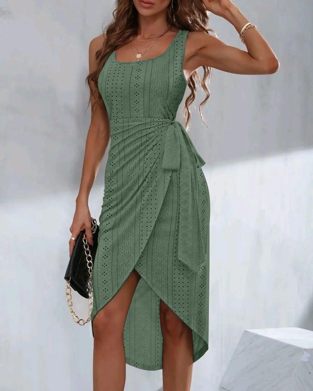 Style:Casual,Chic Type:Asymmetrical,Slit Material:97%Polyester,3%Spandex Neckline:U-Neck Sleeve Style:Sleeveless Length:Midi Pattern Type:Plain Decoration:Eyelet Embroidery,Slit,Tied Detail Fit Type:Skinny Occasion:Daily Package Include:1* Dress Fabric Elasticity:Medium Stretch Sheer:No Care Instructions:Machine wash or professional dry clean