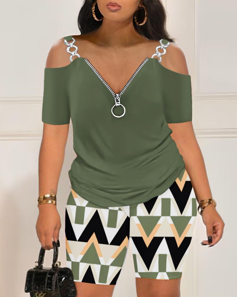 Cold Shoulder Zipper Design Top & Geometric Print Shorts Set