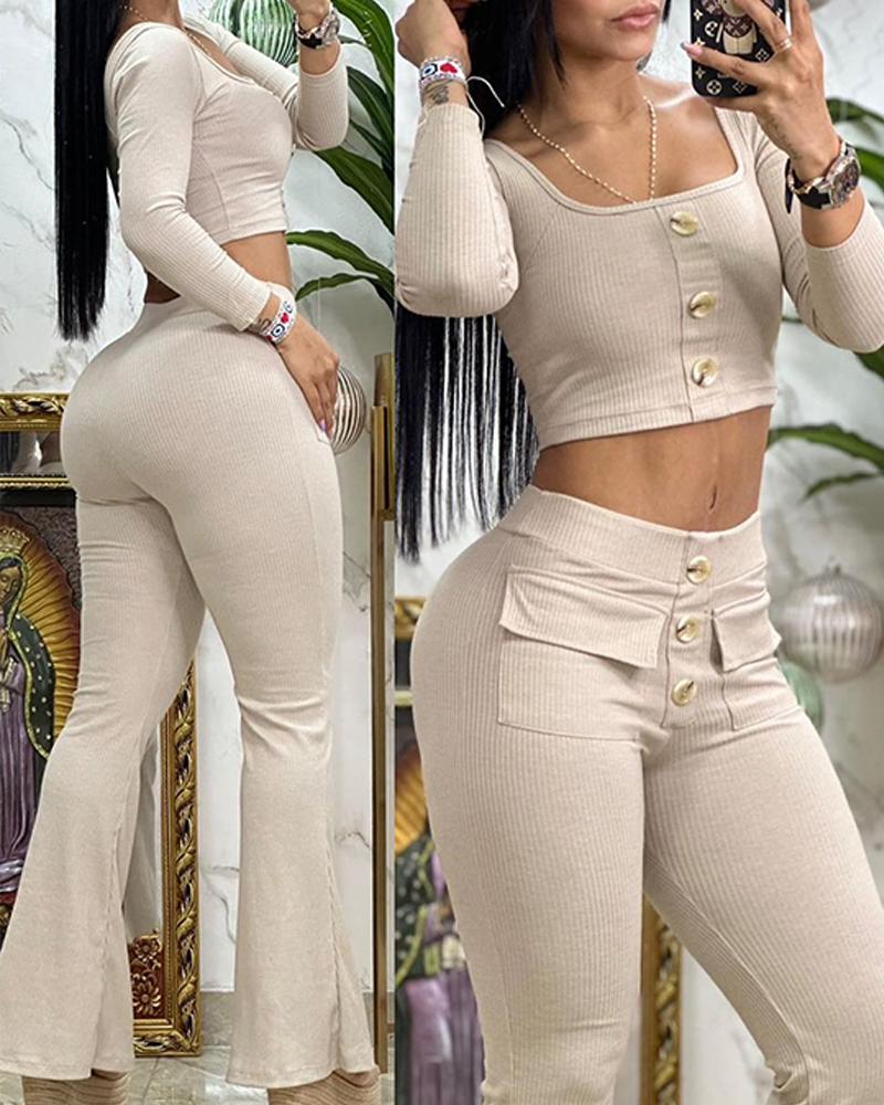 Square Neck Buttoned Top & Pocket Design Flared Pants Set