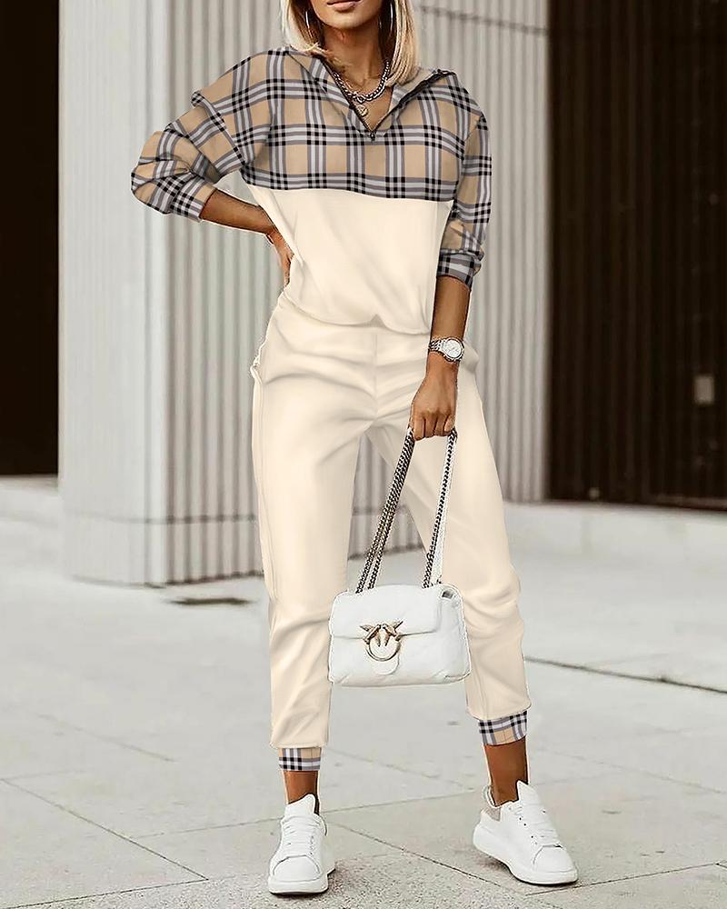 Style:Casual Type:Sweatpants Sets,Sweatshirt Sets Material:97%Polyester,3%Spandex Neckline:Hooded Sleeve Style:Long Sleeve Length:Long Pattern Type:Plaid Decoration:Zipper Fit Type:Regular Occasion:Daily Package Include:Pants Set