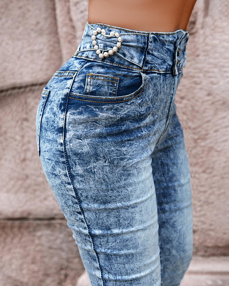 Pearls Decor Buttoned High Waist Skinny Jeans