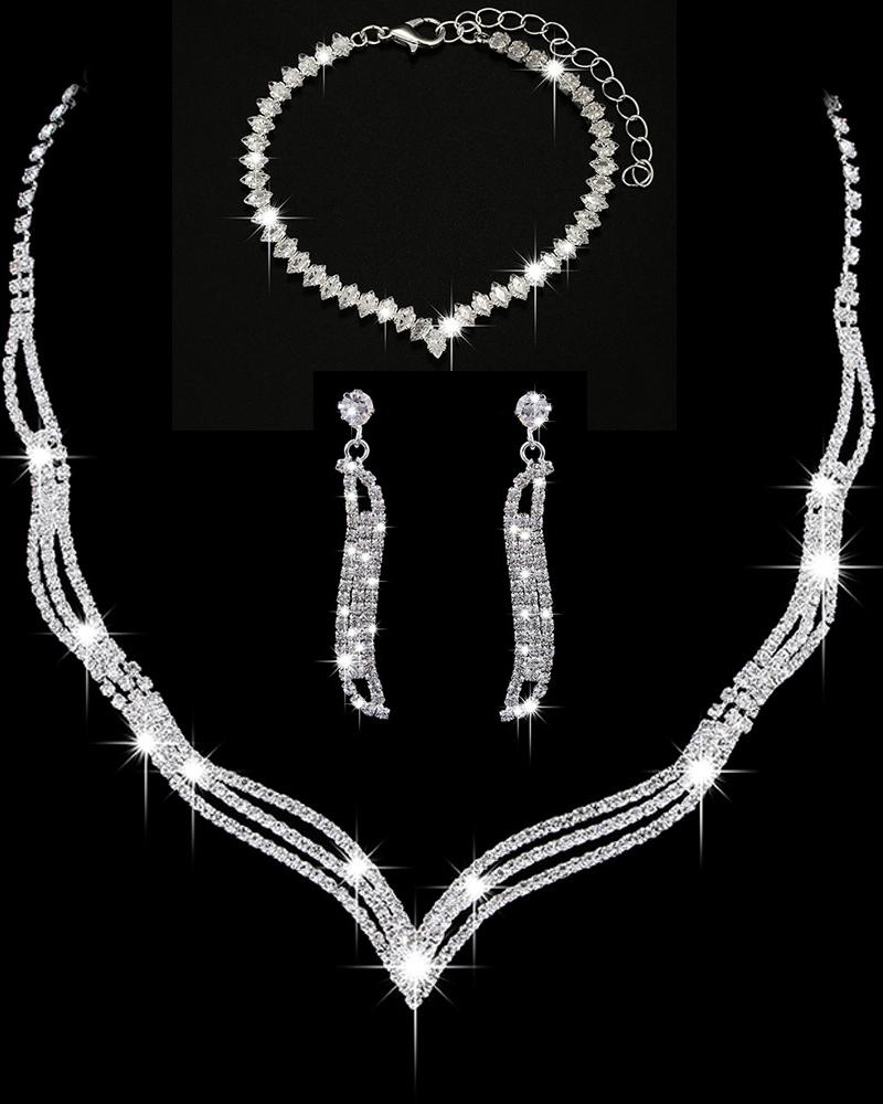 3PCS Rhinestone Hollow Out Chain Necklace & Drop Earrings & Bracelet Evening Party Wedding Jewelry Set