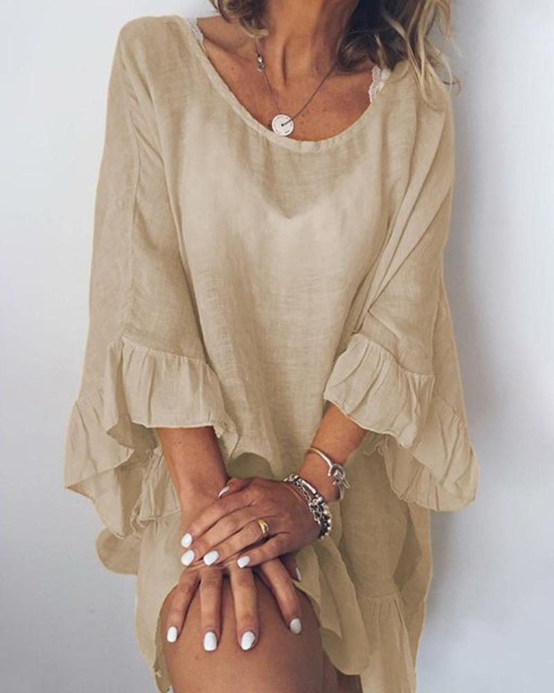 Style:Casual,Chic Type:A Line Material:Polyester Neckline:Round Neck Sleeve Style:Three Quarters Length:Mini Pattern Type:Plain Decoration:Ruffles Fit Type:Regular Occasion:Daily Package Include:1* Dress Fabric Elasticity:Slight Stretch Sleeve Type:Bell Sleeve Sheer:Semi-Sheer Care Instructions:Machine wash or professional dry clean