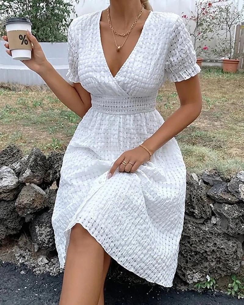Style:Chic Type:A Line Material:Waffle Knit Neckline:V-Neck Sleeve Style:Short Sleeve Length:Midi Pattern Type:Plaid Decoration:Frill Hem Fit Type:Regular Occasion:Daily Package Include:1* Dress Fabric Elasticity:Slight Stretch
