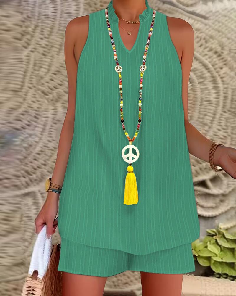 Style:Casual,Chic Type:Shorts Set Material:100%Polyester Neckline:Notch Neck Sleeve Style:Sleeveless Length:Above Knee Pattern Type:Plain Decoration:Frill Hem Fit Type:Regular Occasion:Daily,Vacation Package Include:Shorts Sets Fabric Elasticity:Slight Stretch Sheer:No Care Instructions:Machine wash or professional dry clean
