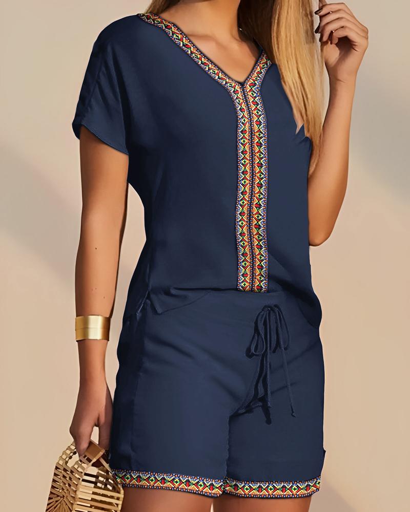 Style:Casual Type:Shorts Set Material:100%Polyester Neckline:V-Neck Sleeve Style:Short Sleeve Length:Above Knee Pattern Type:Contrast Paneled,Tribal Decoration:Drawstring Fit Type:Regular Occasion:Daily Package Include:1*Shorts Set Fabric Elasticity:Slight Stretch Sheer:No Care Instructions:Machine wash or professional dry clean Waist Line:High Waist