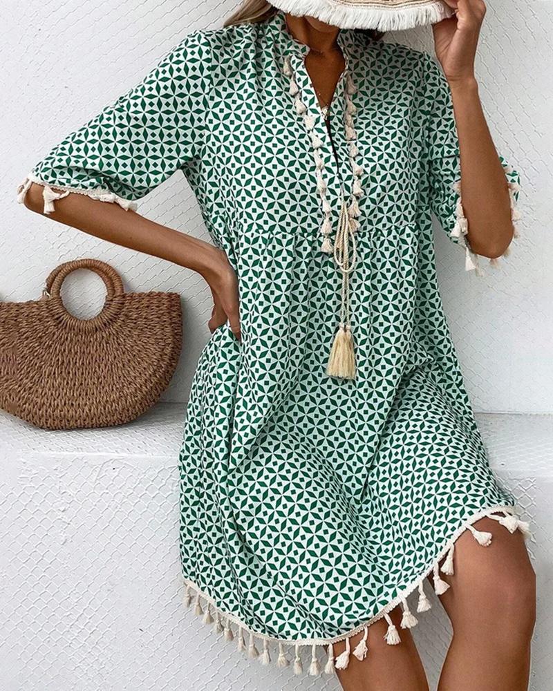 Style:Casual,Chic Type:A Line Material:Polyester Neckline:Stand Collar Sleeve Style:Half Sleeve Length:Mini Pattern Type:Plain Decoration:Tassel Fit Type:Regular Occasion:Daily Package Include:1* Dress Fabric Elasticity:Slight Stretch Sheer:No Care Instructions:Machine wash or professional dry clean