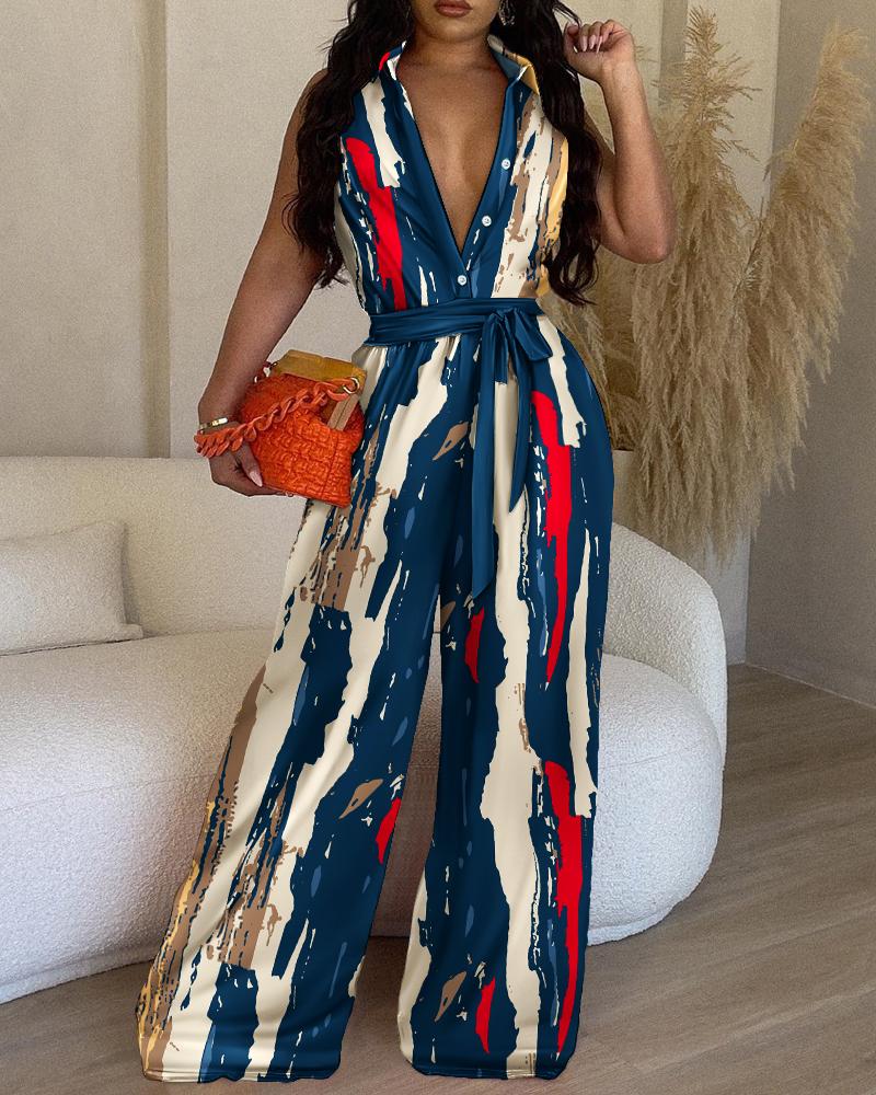 Style:Chic Type:Jumpsuit Material:100%Polyester Neckline:Turn-down Collar Sleeve Style:Sleeveless Length:Long Pattern Type:Abstract,Striped,Tie Dye Decoration:Button,Tied Detail Fit Type:Regular Occasion:Daily,Vacation Package Include:1*Jumpsuit Fabric Elasticity:Slight Stretch Sheer:No Care Instructions:Machine wash or professional dry clean