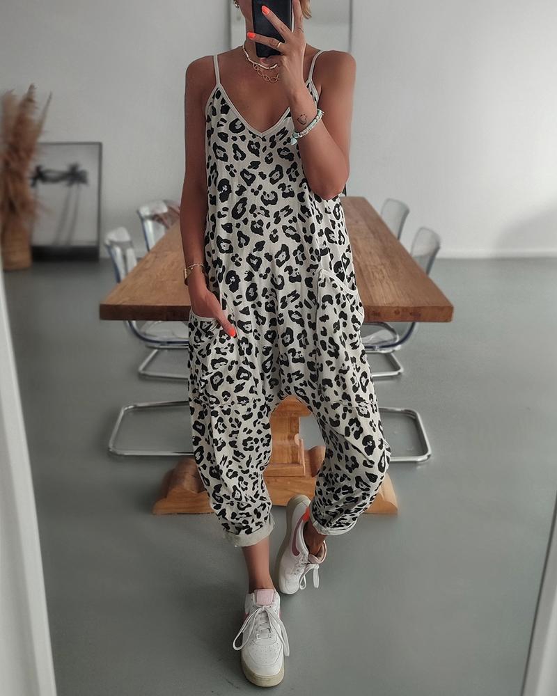 Style:Casual Type:Jumpsuit Material:Polyester Neckline:V-Neck Sleeve Style:Sleeveless Length:Long Pattern Type:Leopard Decoration:Pocket Fit Type:Regular Occasion:Daily Package Include:1*Jumpsuit Fabric Elasticity:Slight Stretch Sheer:No Care Instructions:Machine wash or professional dry clean