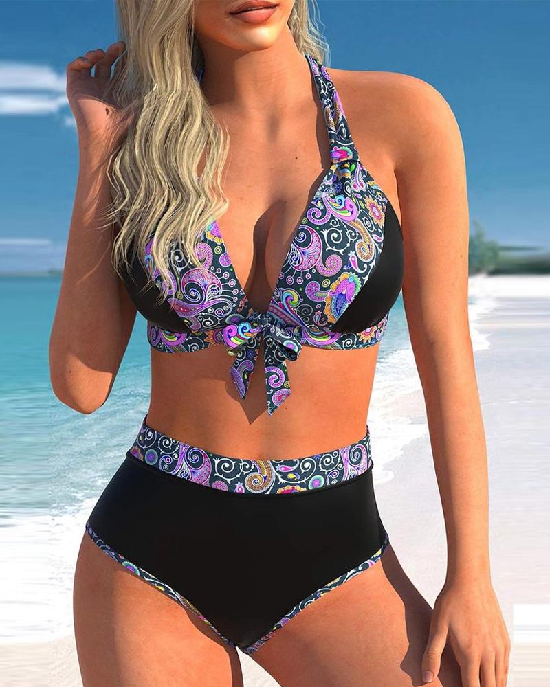 Style:Chic Type:Wireless Bra Material:80%Polyamide,20%Elastane Neckline:Halter Sleeve Style:Sleeveless Length:Regular Pattern Type:Paisley Decoration:Tied Detail Fit Type:Skinny Occasion:Beach,Vacation Package Include:1*Swimwear Fabric Elasticity:High Stretch