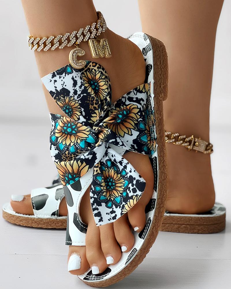 Sunflower Cow Print Tied Detail Toe Ring Slippers