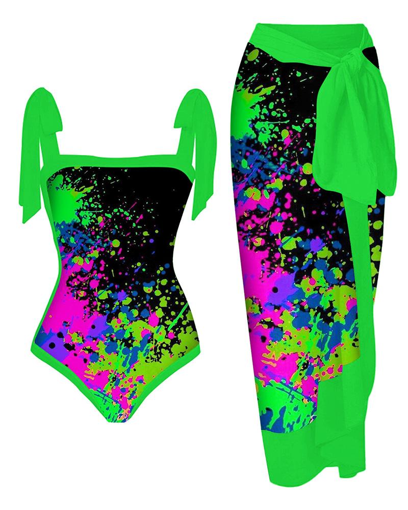 Ink Splash Print One Piece Swimsuit With Cover Up