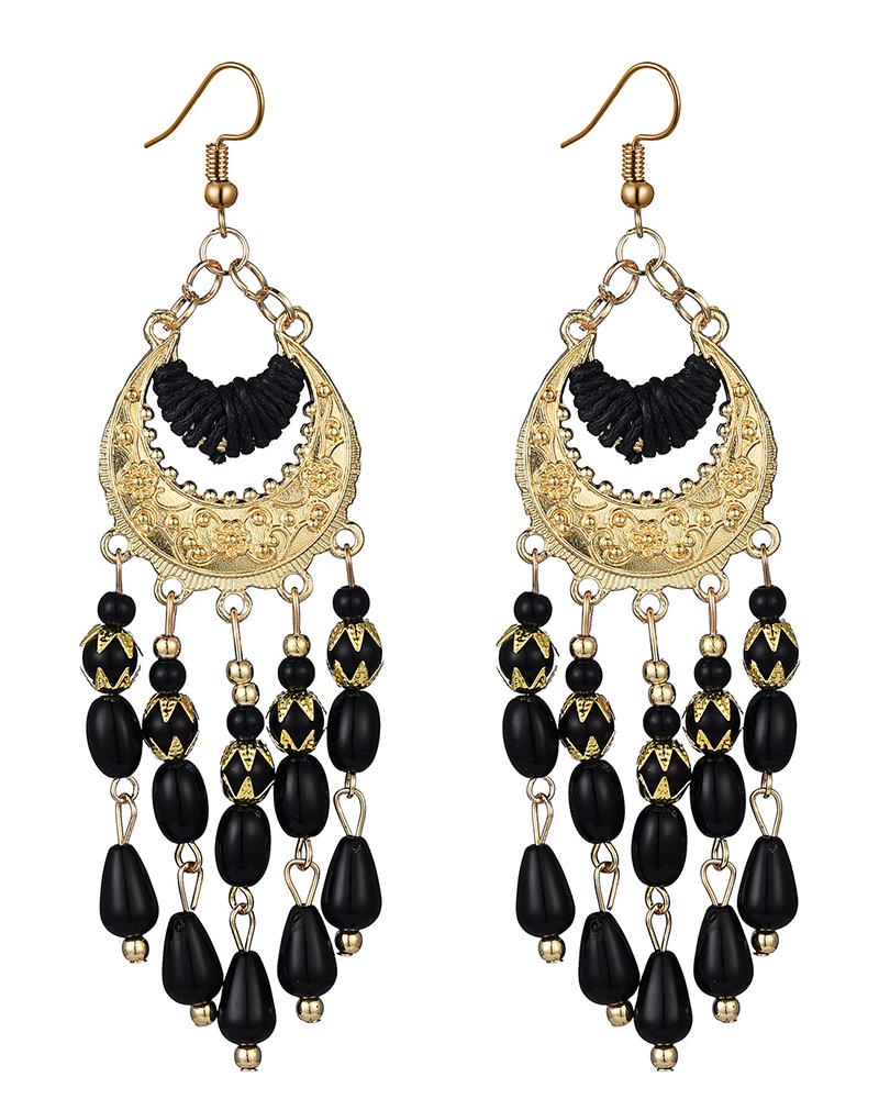 1Pair Bohemian Floral Embossed Beaded Tassel Hook Earrings